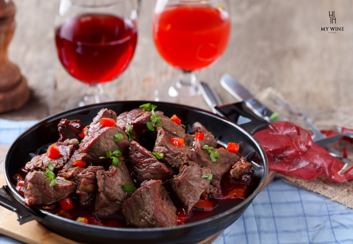 Các món ăn có nước sốt đậm đà như thịt kho, bò kho, thịt bò xào hành tây… Hương vị đậm đà của món ăn cân bằng với vị của rượu vang đỏ sẽ làm nổi bật hương vị và làm mềm vị chát của rượu vang.